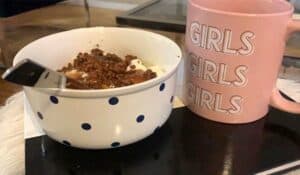 - 7.00 uur: Iedereen slaapt nog en ik maak weer magere yoghurt met PS. Food & Lifestyle muesli met donkere chocola en karamel-zee zout stroop en drink een kopje thee