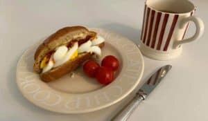 PS. Food & Lifestyle (voorheen Powerslim) croissantje met een hardgekookt ei, rode pesto en tomaatjes en een kopje thee.