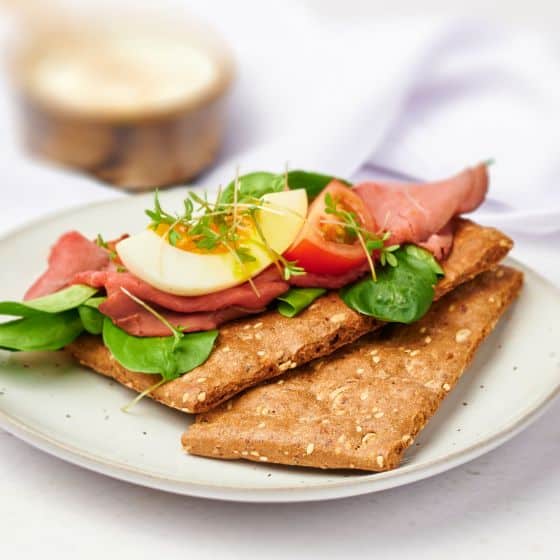 Doosje met producten voor de 3e dag PowerSlim, bestaande uit: witbrood, dessert aardbei-blauwe bes, crackers, reep crispy appel, zalm wrap en hot chili minibites.